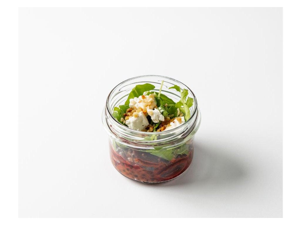 Složení: pečená červená řepa, beluga čočka, kozí sýr, lískové ořechy, rukola, dresink (sušená rajčata, balsamiko ocet, hořčice, česnek, med, máta, pepř, rostlinný olej)